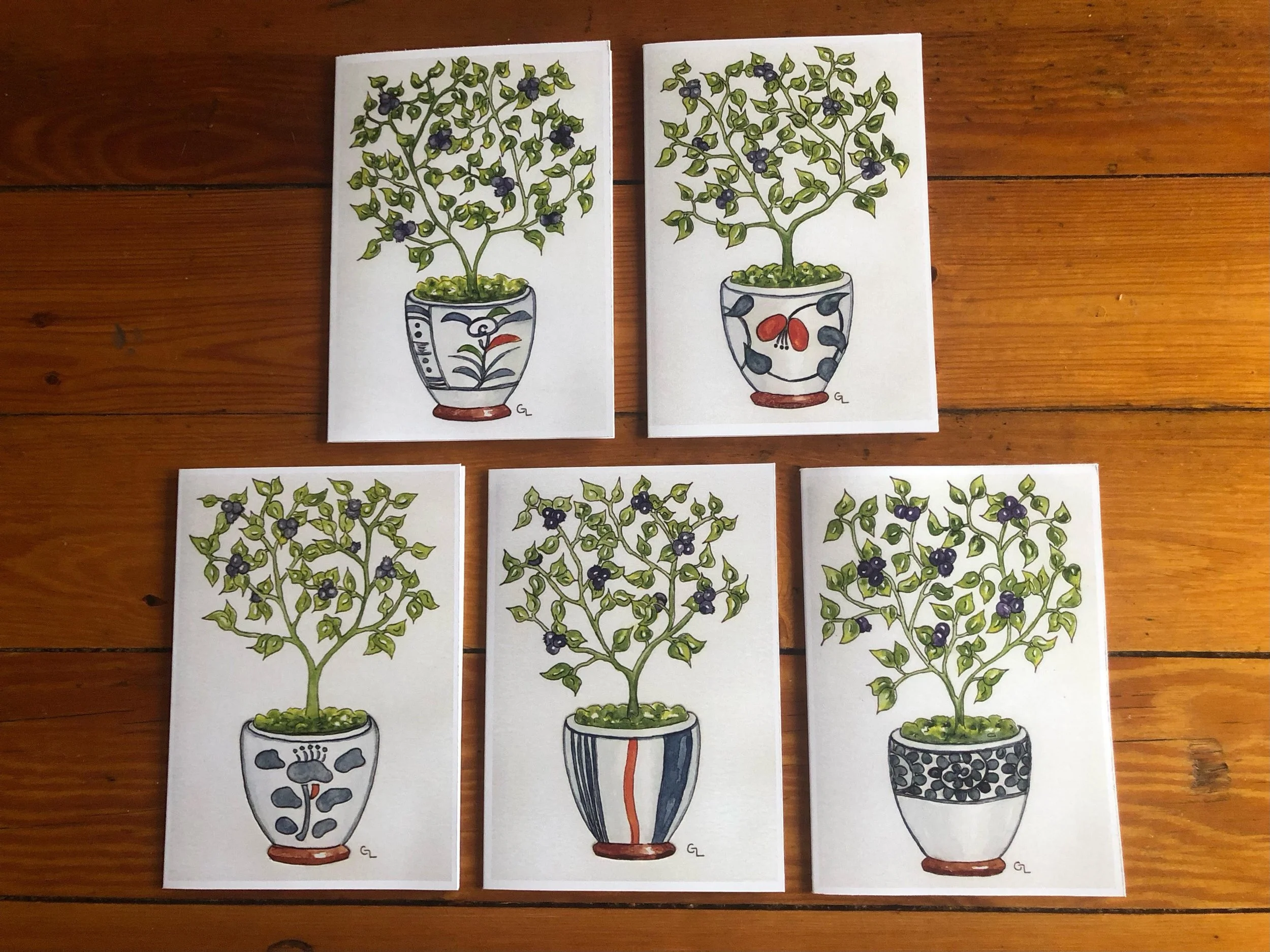 Blueberry Series. 5-card pack for $15. Cards are 4” x 5 1/2”, bland inside, and come with envelopes.